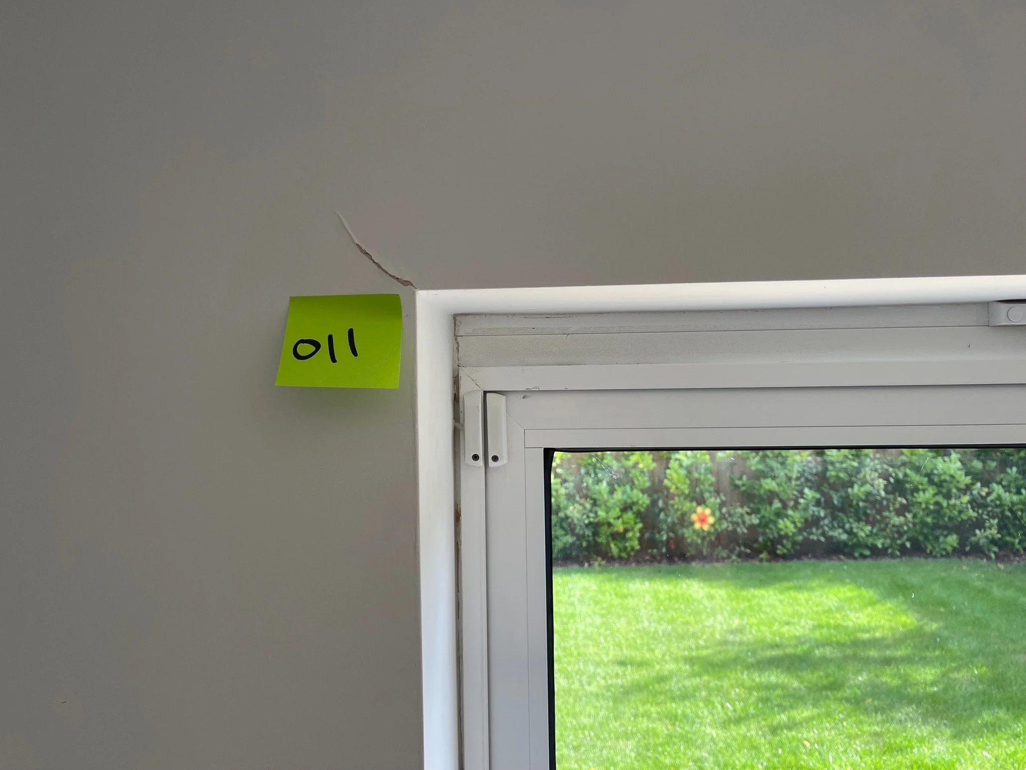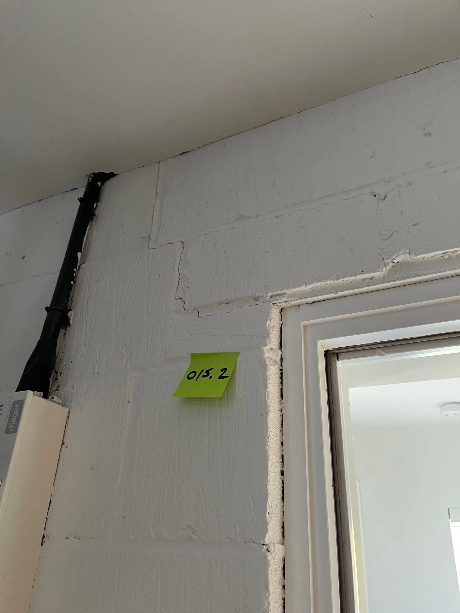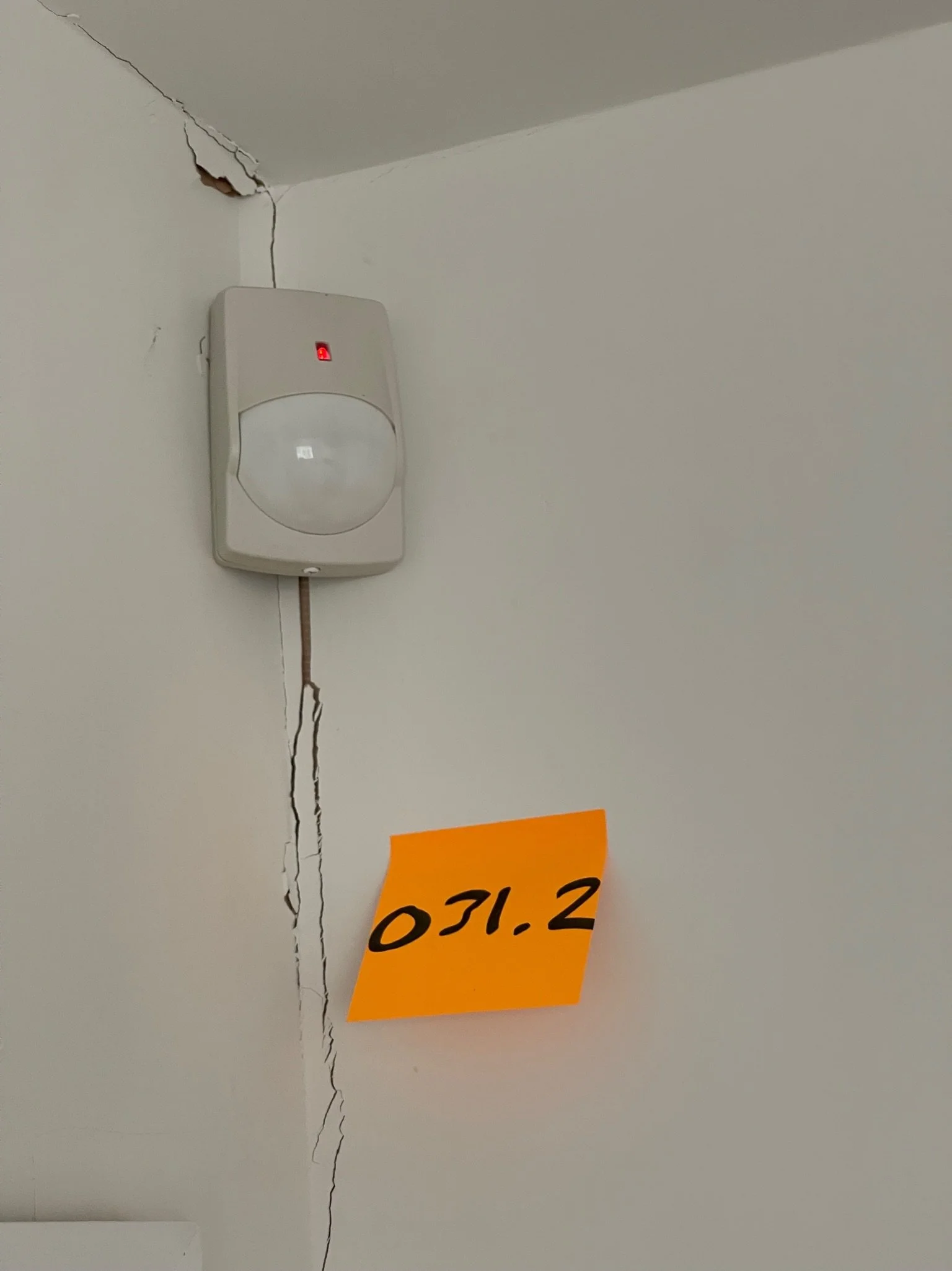 Cracked wall corner with visible damage and an orange sticky note with a number.