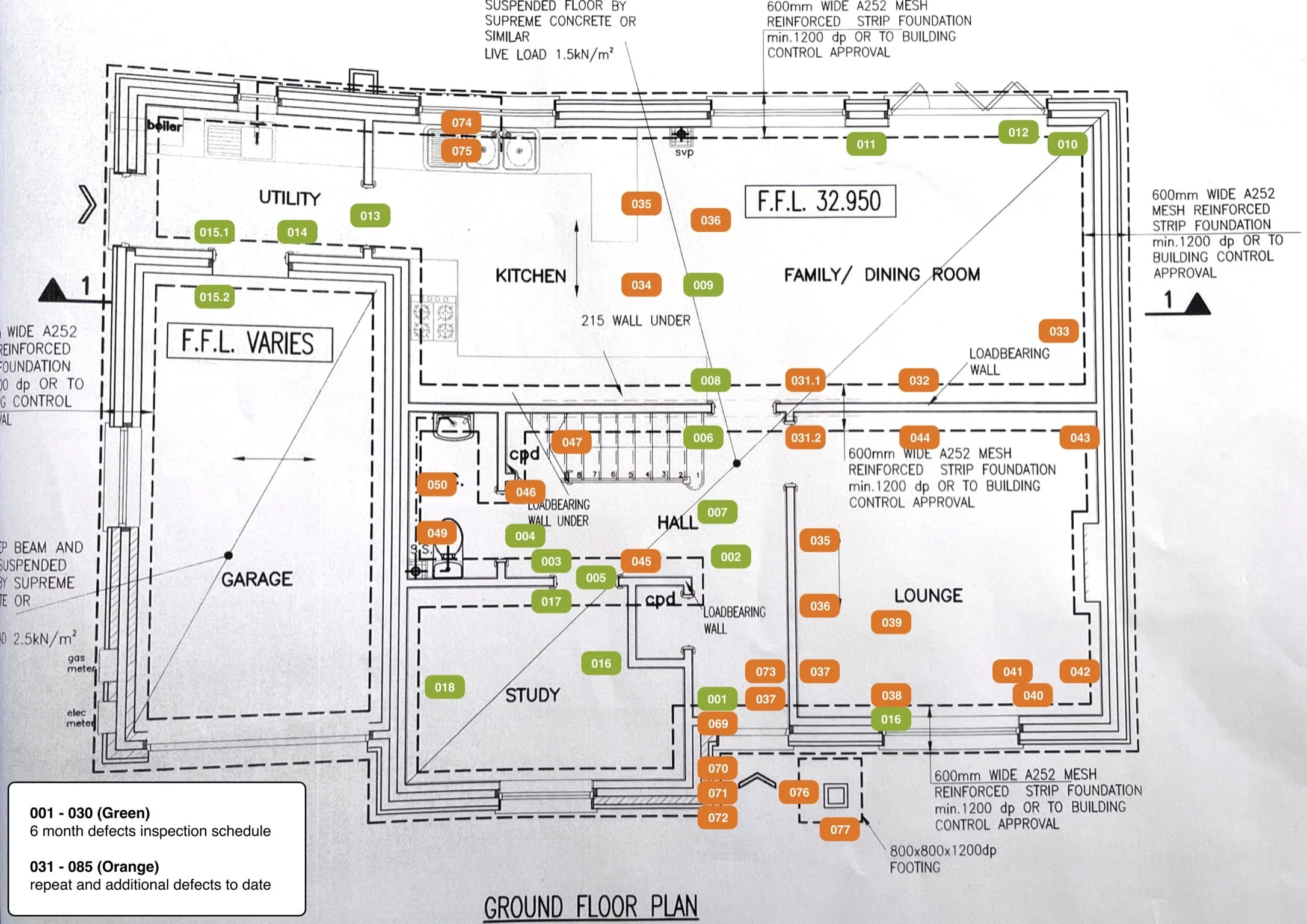 Architectural floor plan of a building's ground floor with labeled areas, including a garage, utility room, kitchen, dining room, hall, study, lounge, and various notes marked in green and orange indicating defect inspection schedules and additional