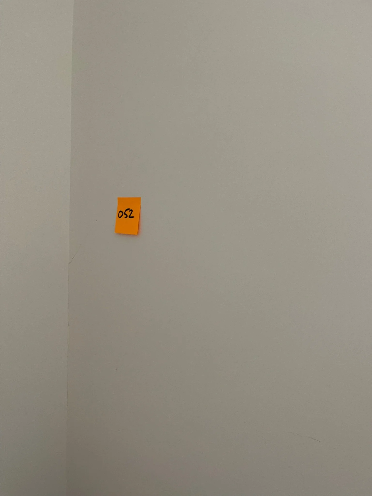 Gray wall with a small orange sticky note labeled "052."