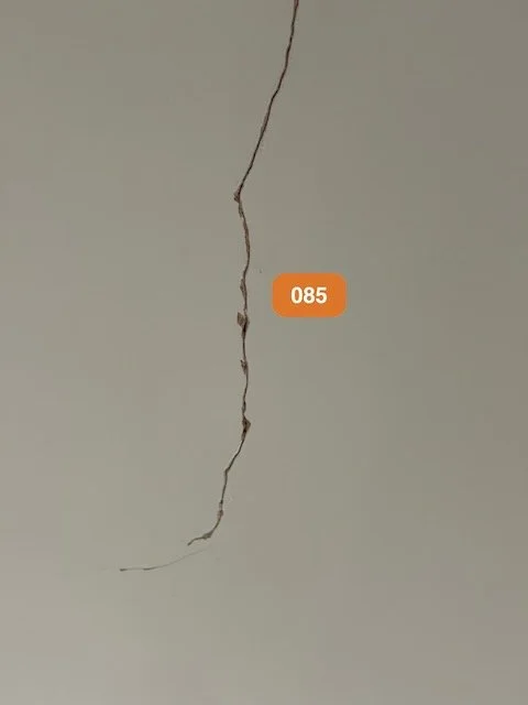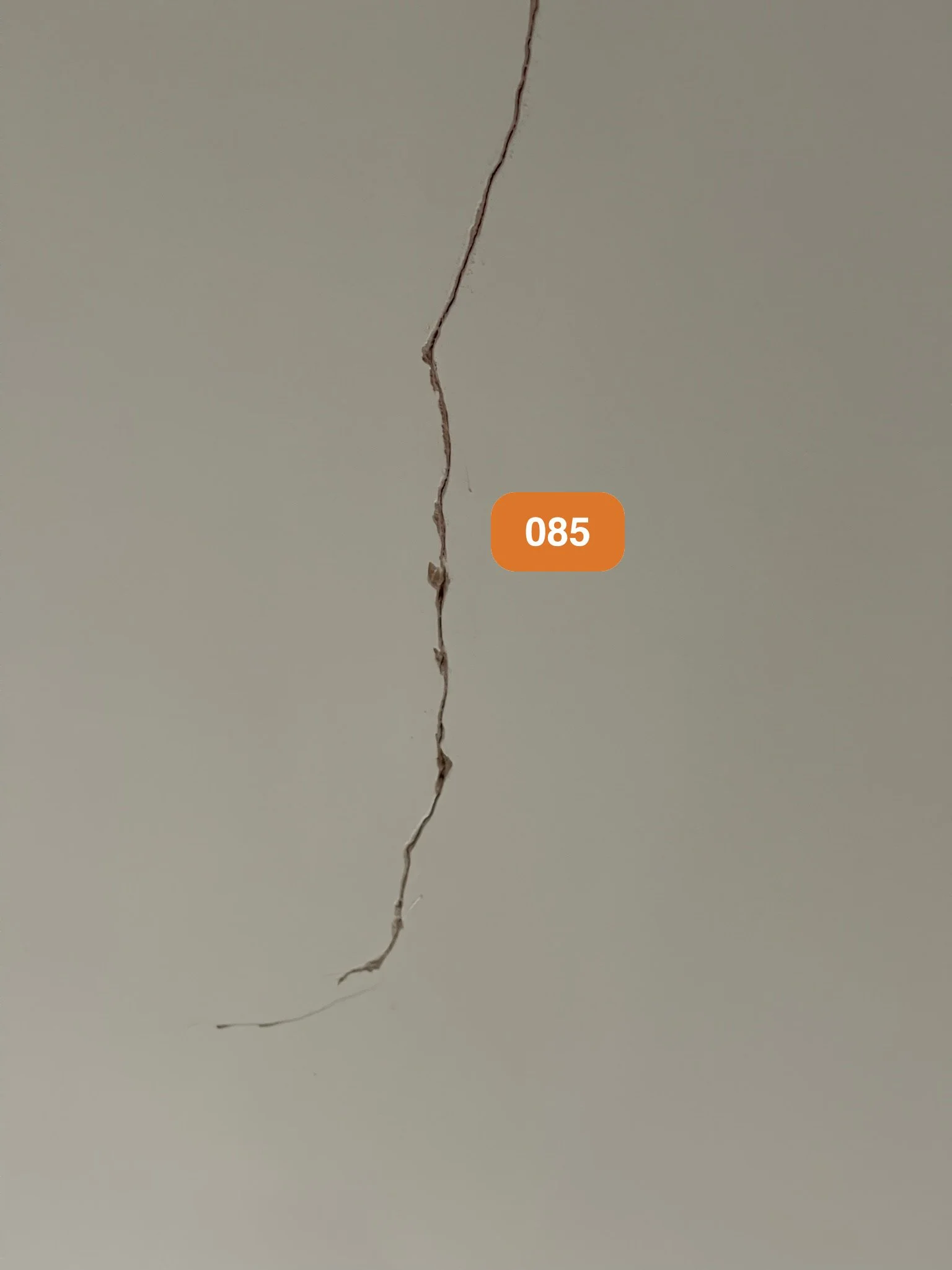 Close-up of a crack in a gray wall with an orange label displaying the number 085.