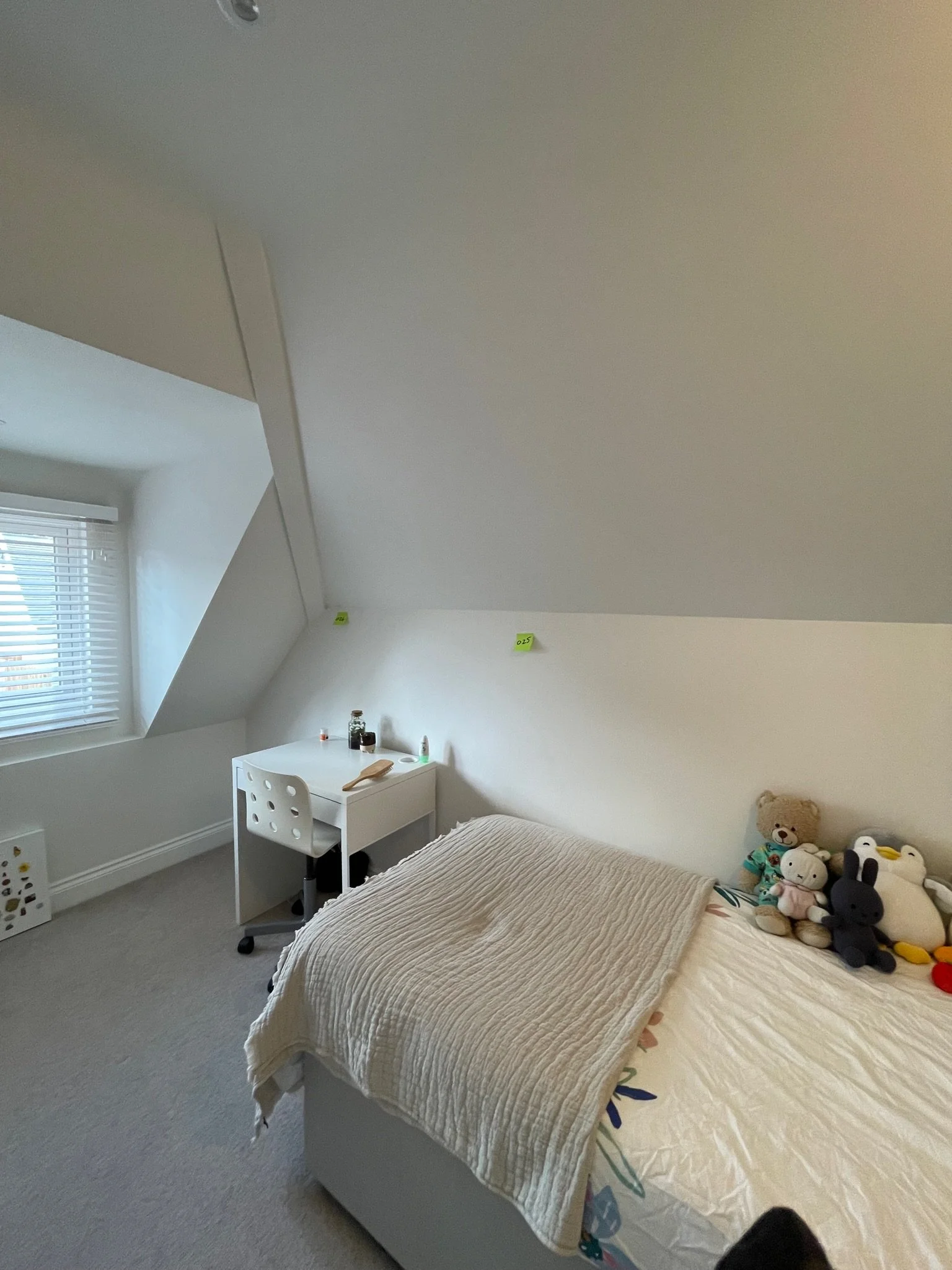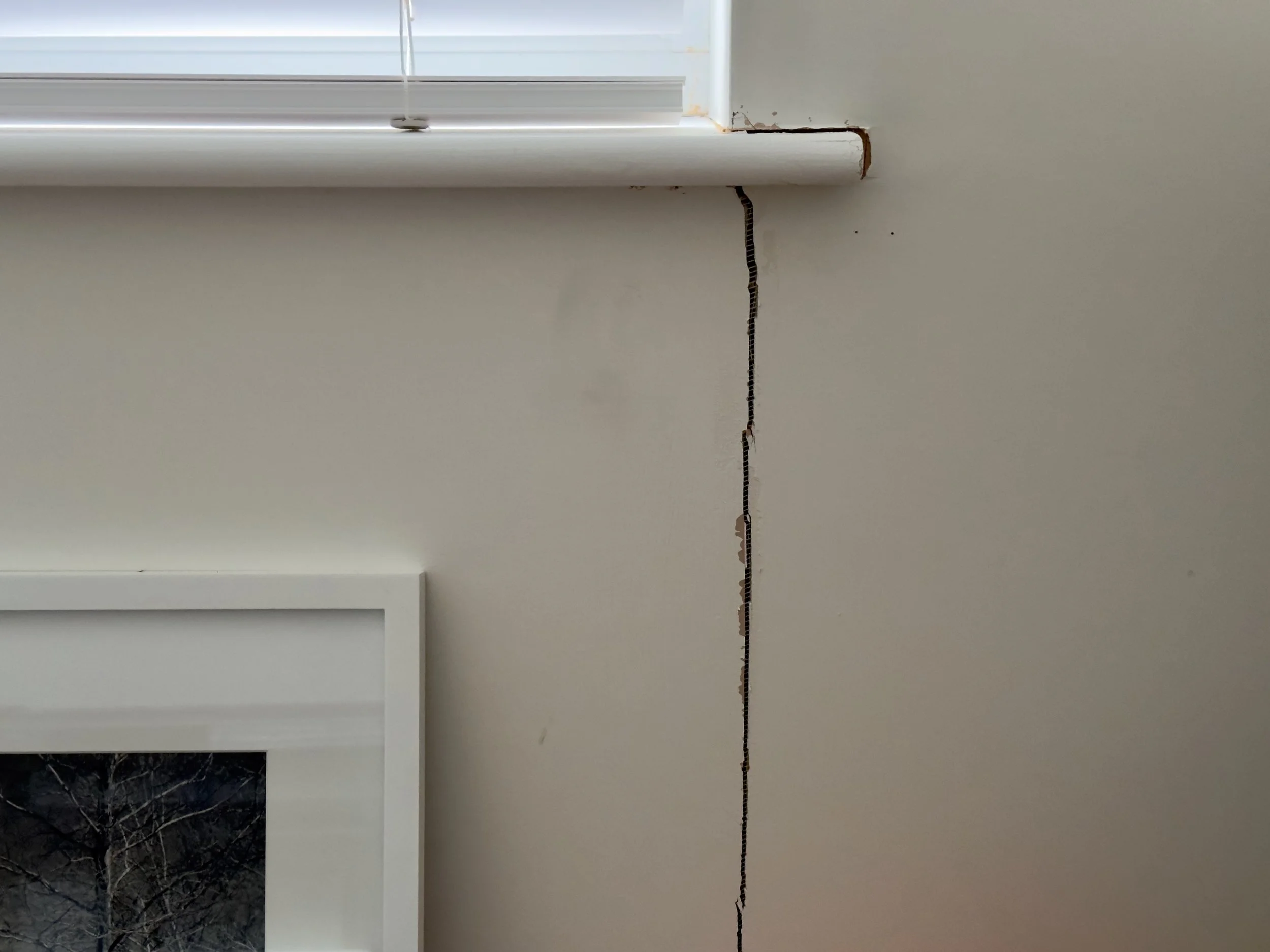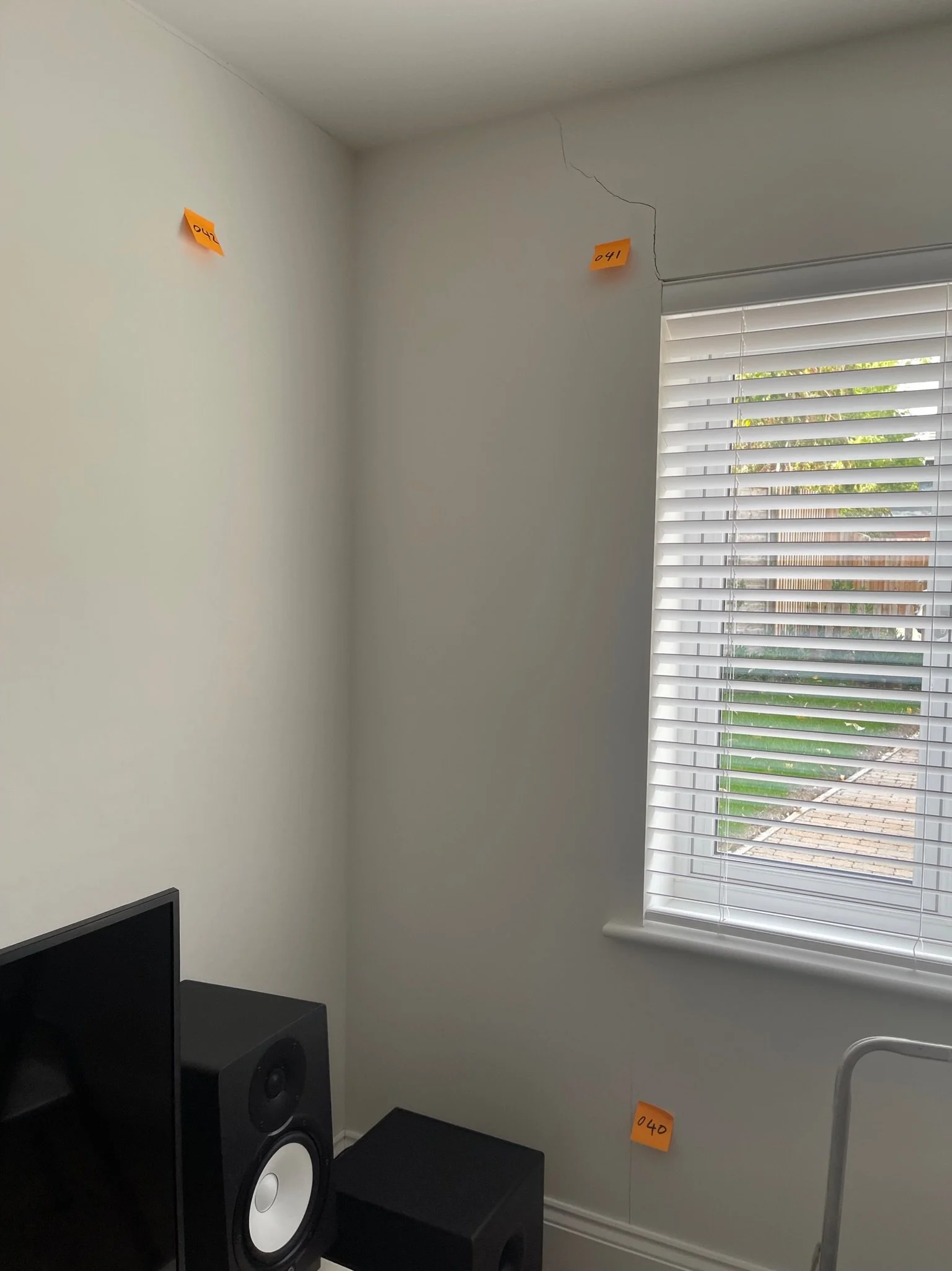 Room corner with a crack in the wall, white blinds on a window, and orange sticky notes. A speaker and TV are visible.