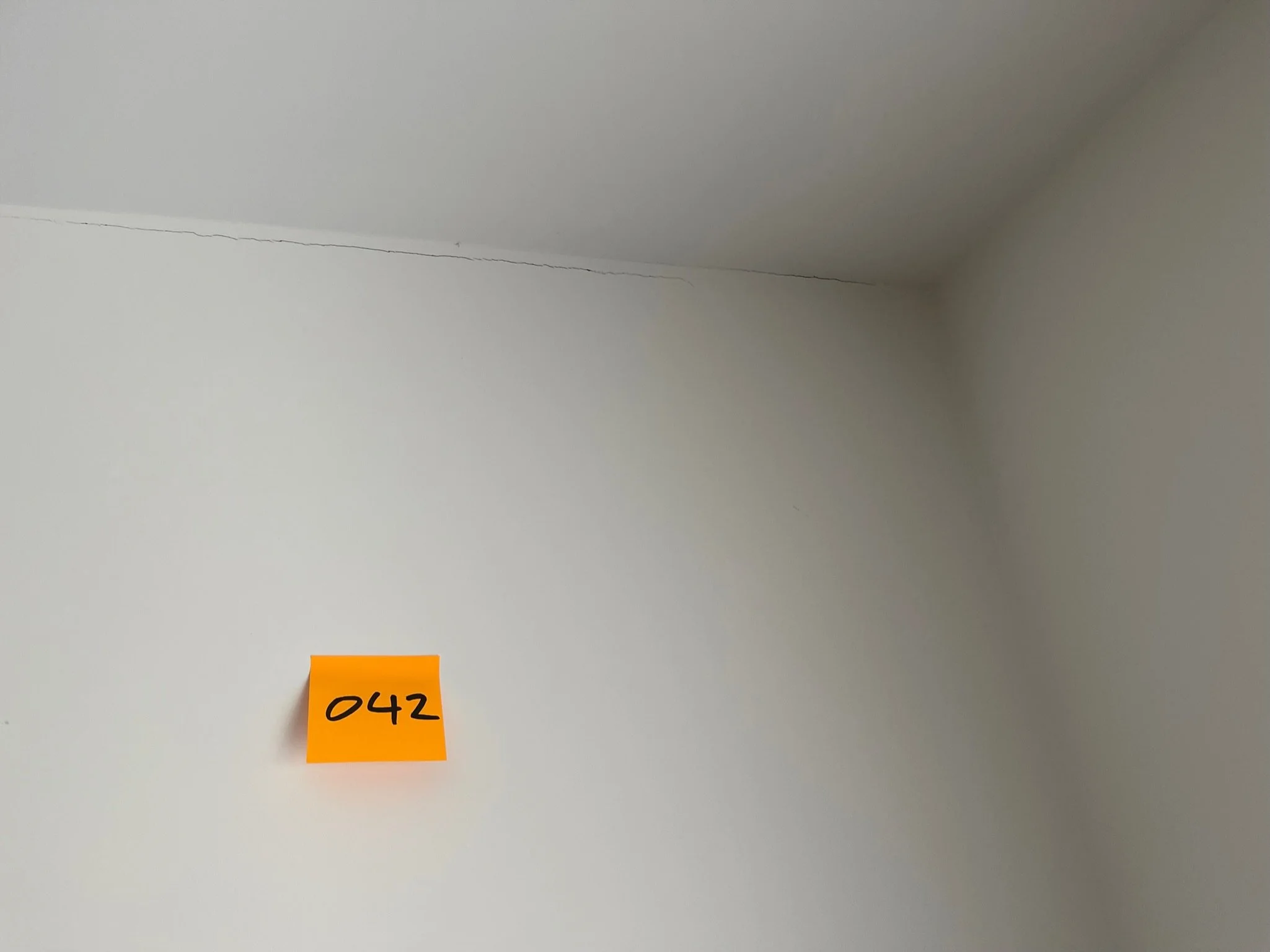 Corner of a room with white walls and a yellow sticky note labeled '042'.