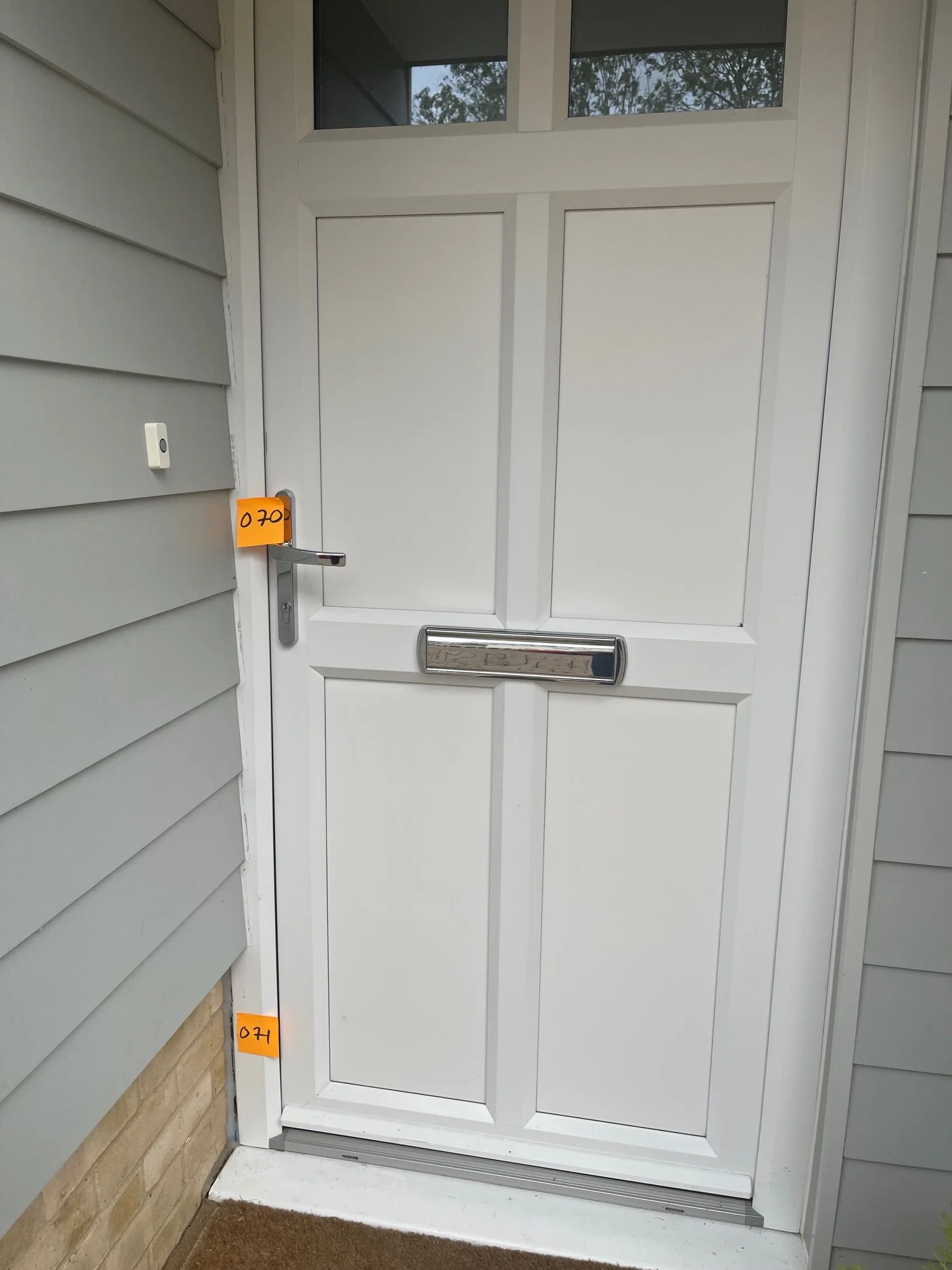 White front door with panel design, mail slot, and small windows, marked with orange labels numbered 070 and 071, surrounded by light gray siding and brickwork.
