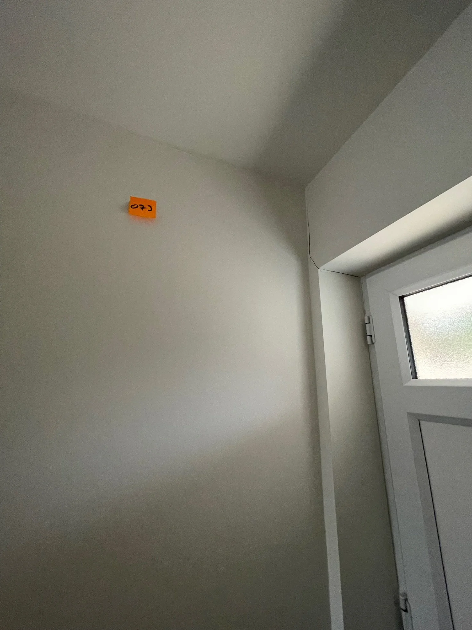 Cracked wall near corner with small visible damage and an orange label with the number 080.