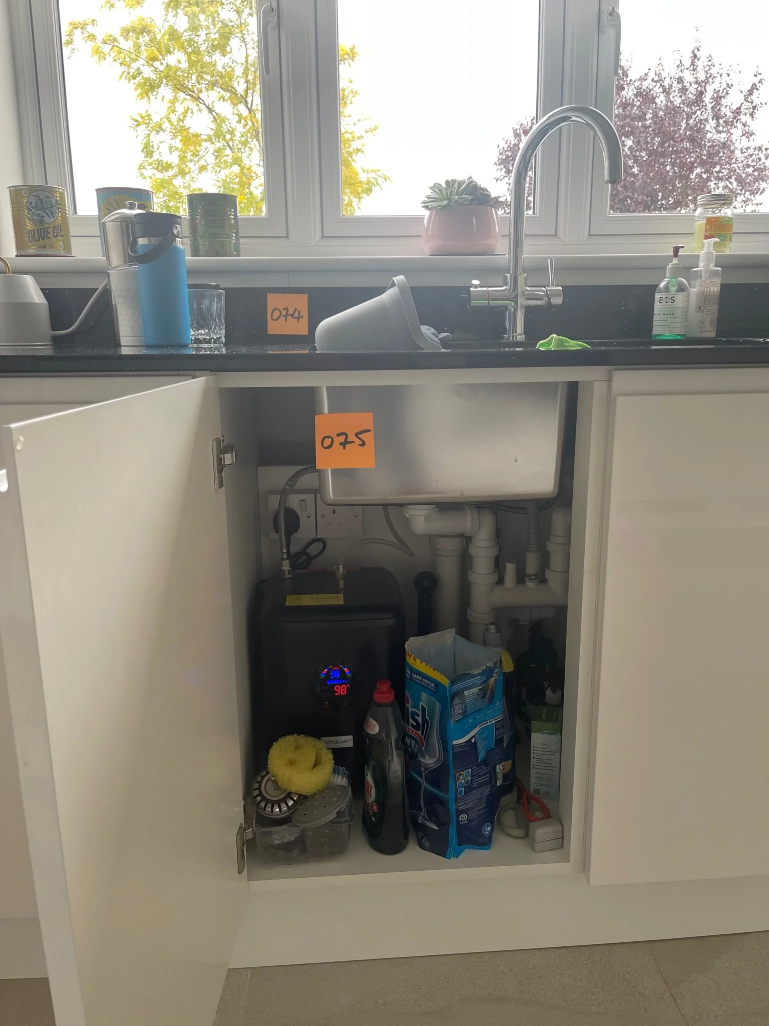 kitchen sink area with open cabinet and cleaning supplies