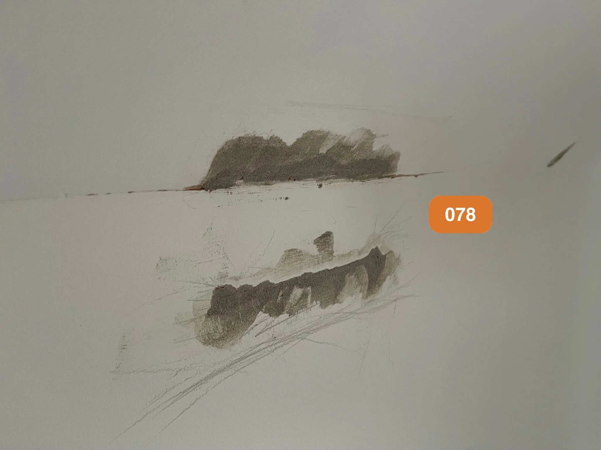 Sketch of lips on a wall with smudged charcoal and an orange label "078"