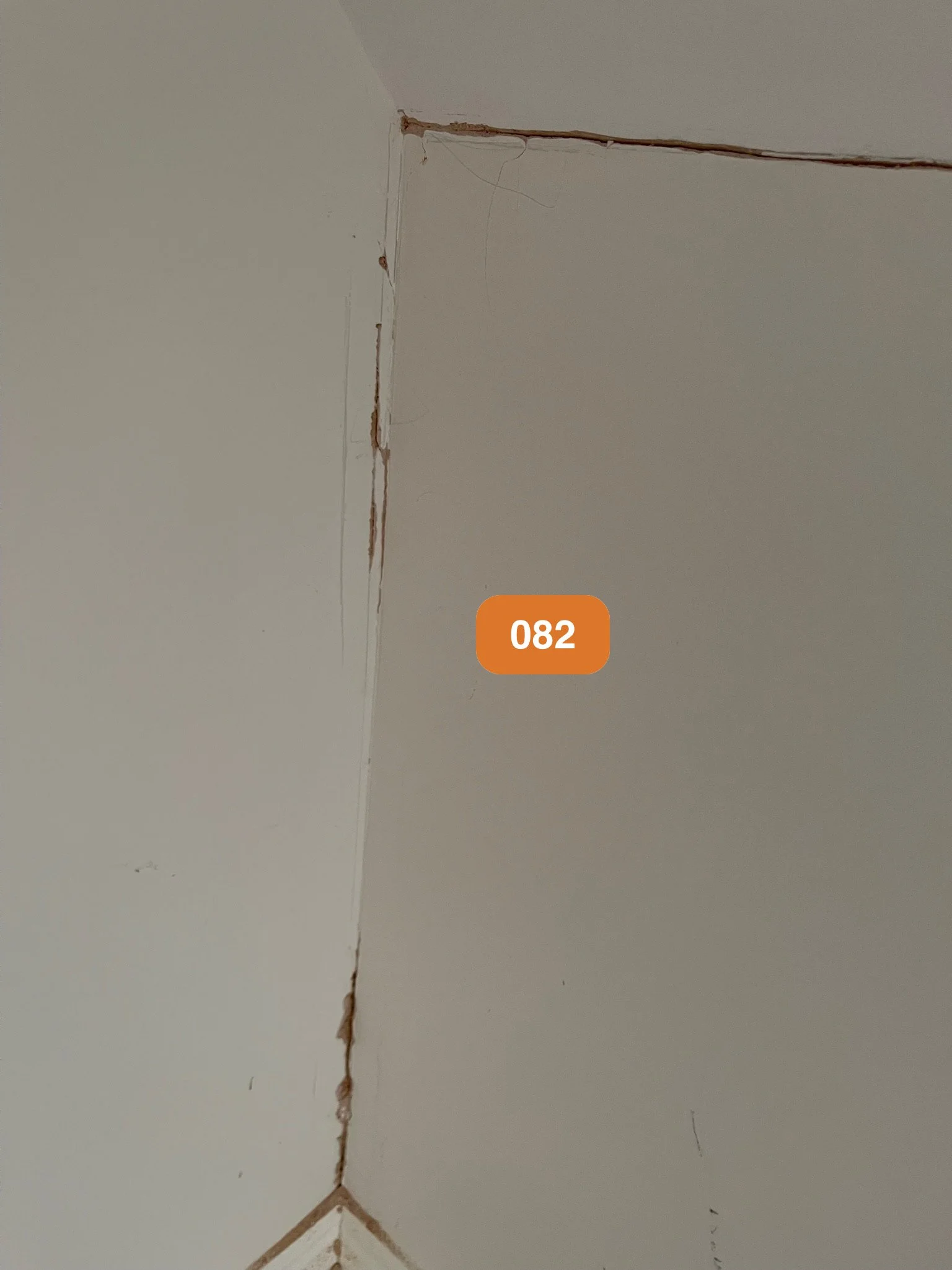 Wall corner with small cracks and gaps, with an orange label reading '082'