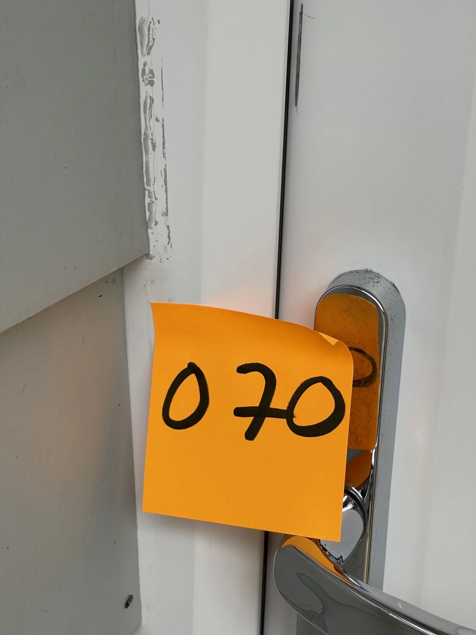 Orange sticky note with "070" handwritten, attached to a door handle.
