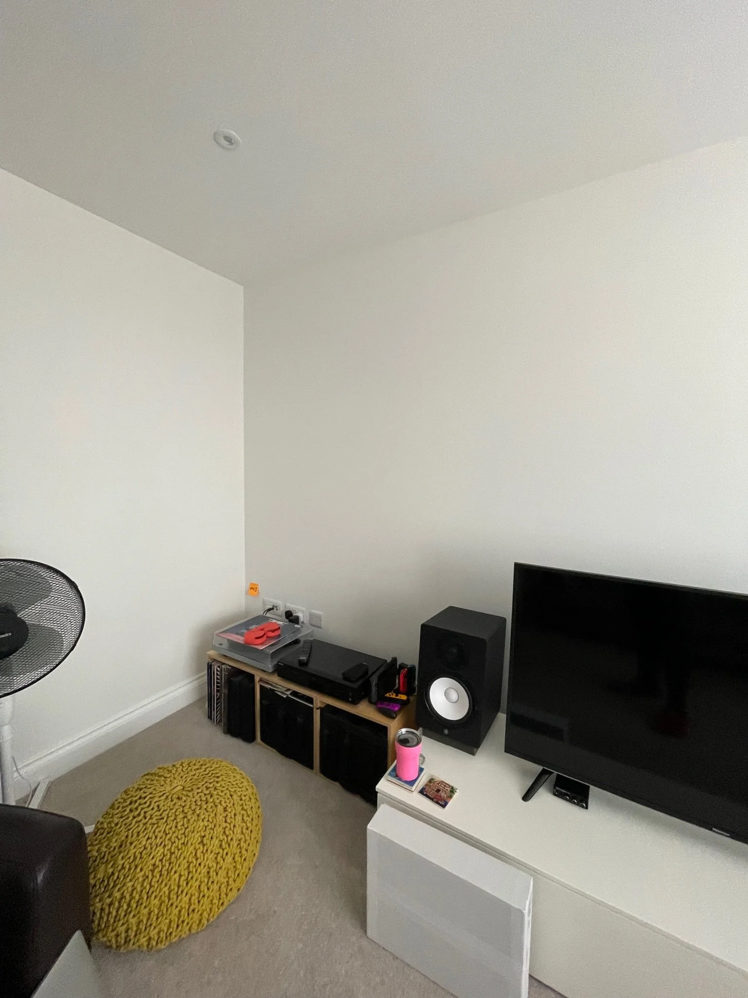 A minimalistic room corner featuring a television on a white TV stand, a speaker, and a fan. A wooden shelf holds a turntable, with vinyl records stored underneath. There's a large knitted yellow pouf on the floor. The room has plain white walls and