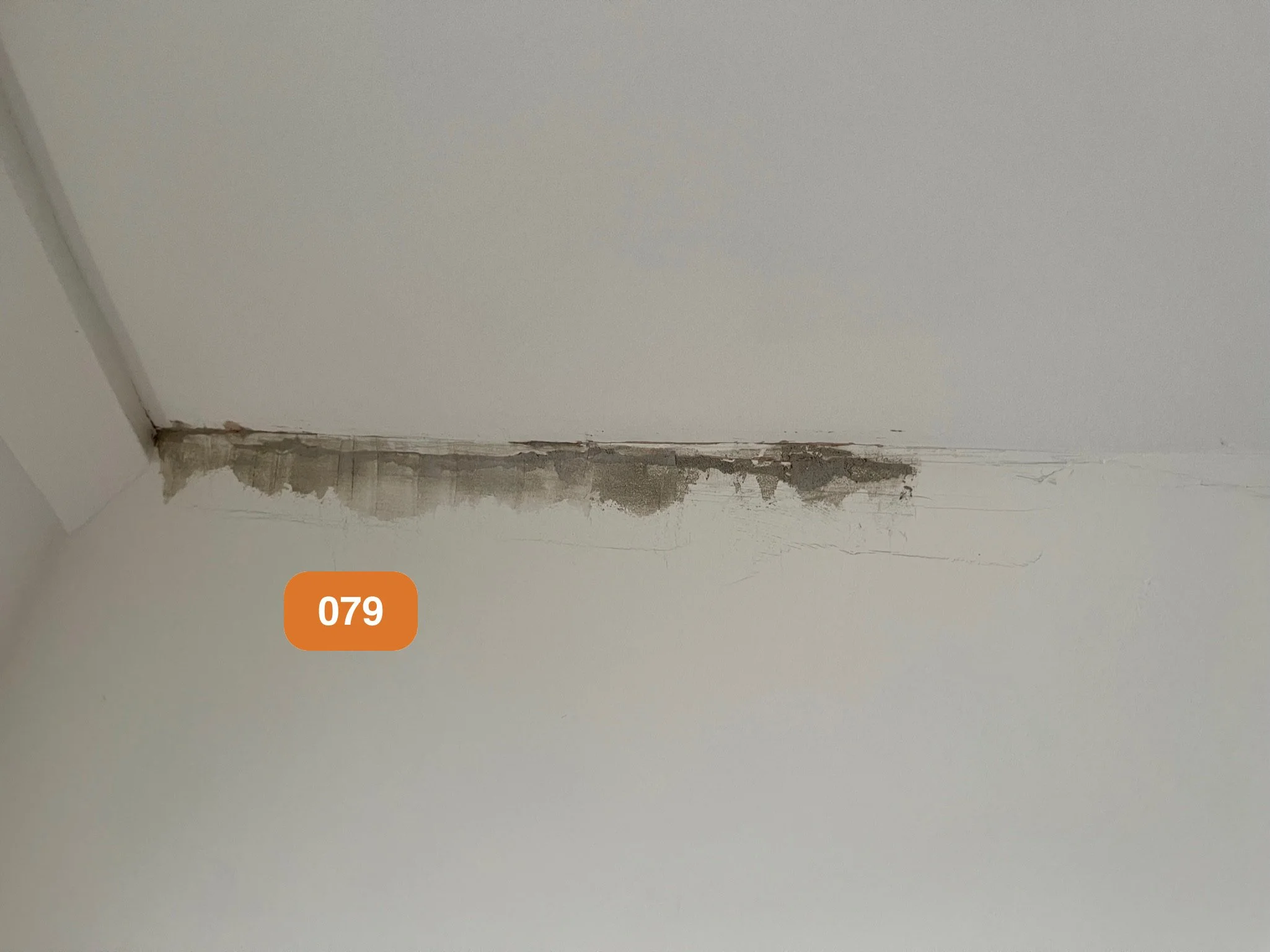 Ceiling corner with water damage and peeling paint, labeled 079.