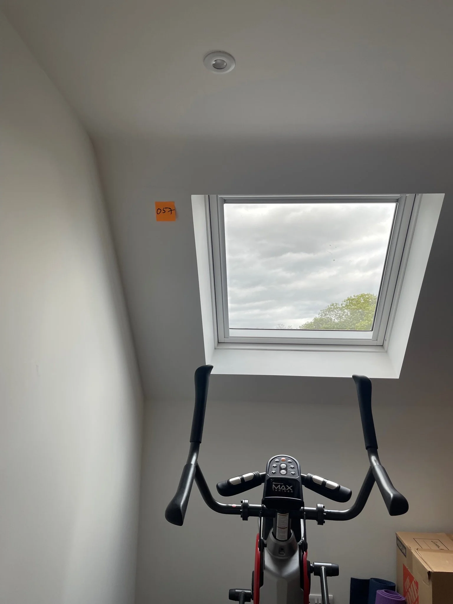 Exercise bike under a skylight in a room with a ceiling light and cardboard boxes on the floor.