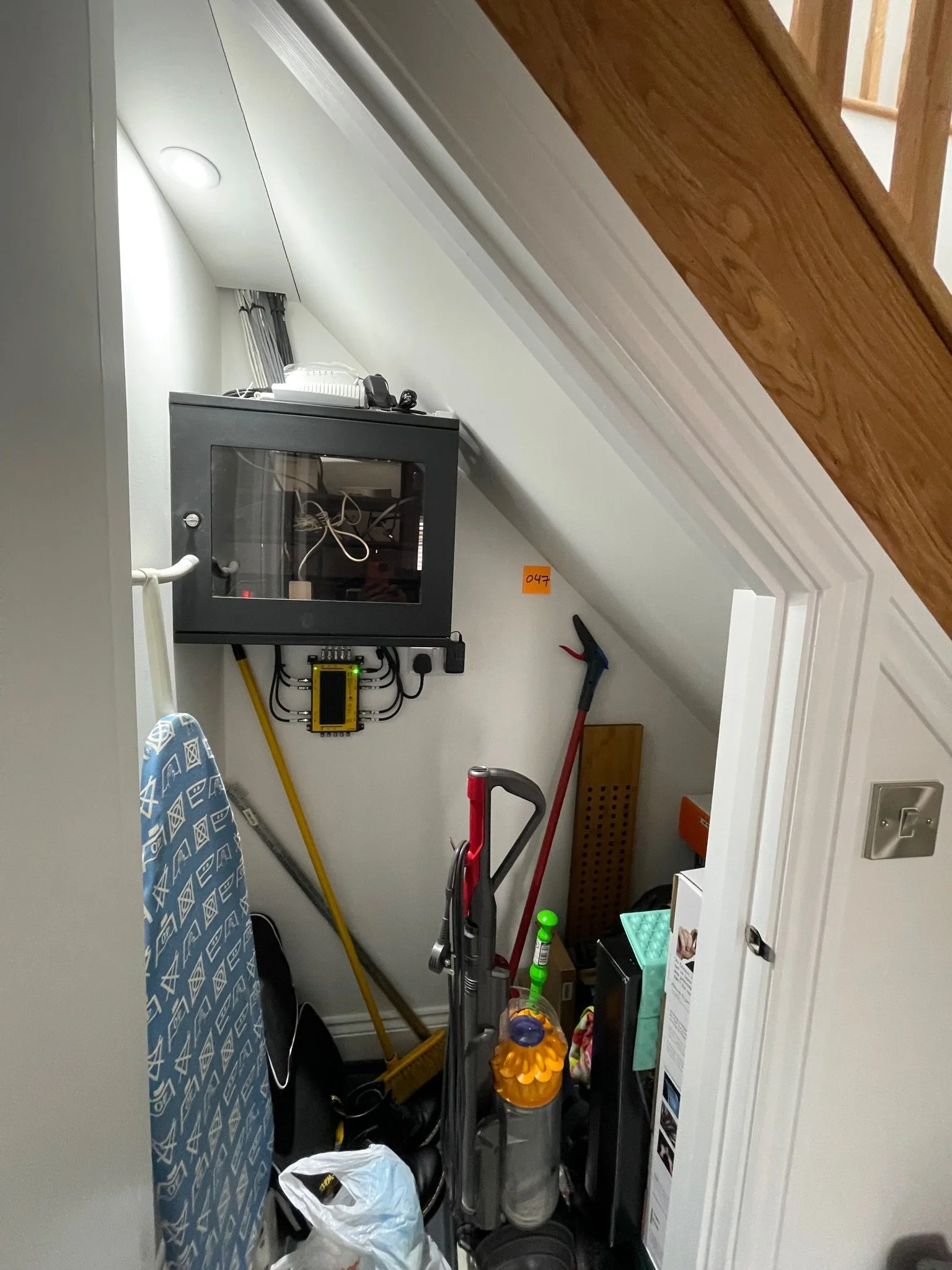 Small storage closet under stairs with a fuse box, vacuum cleaner, ironing board, broom, and cleaning supplies. Walls painted white with wooden staircase visible.