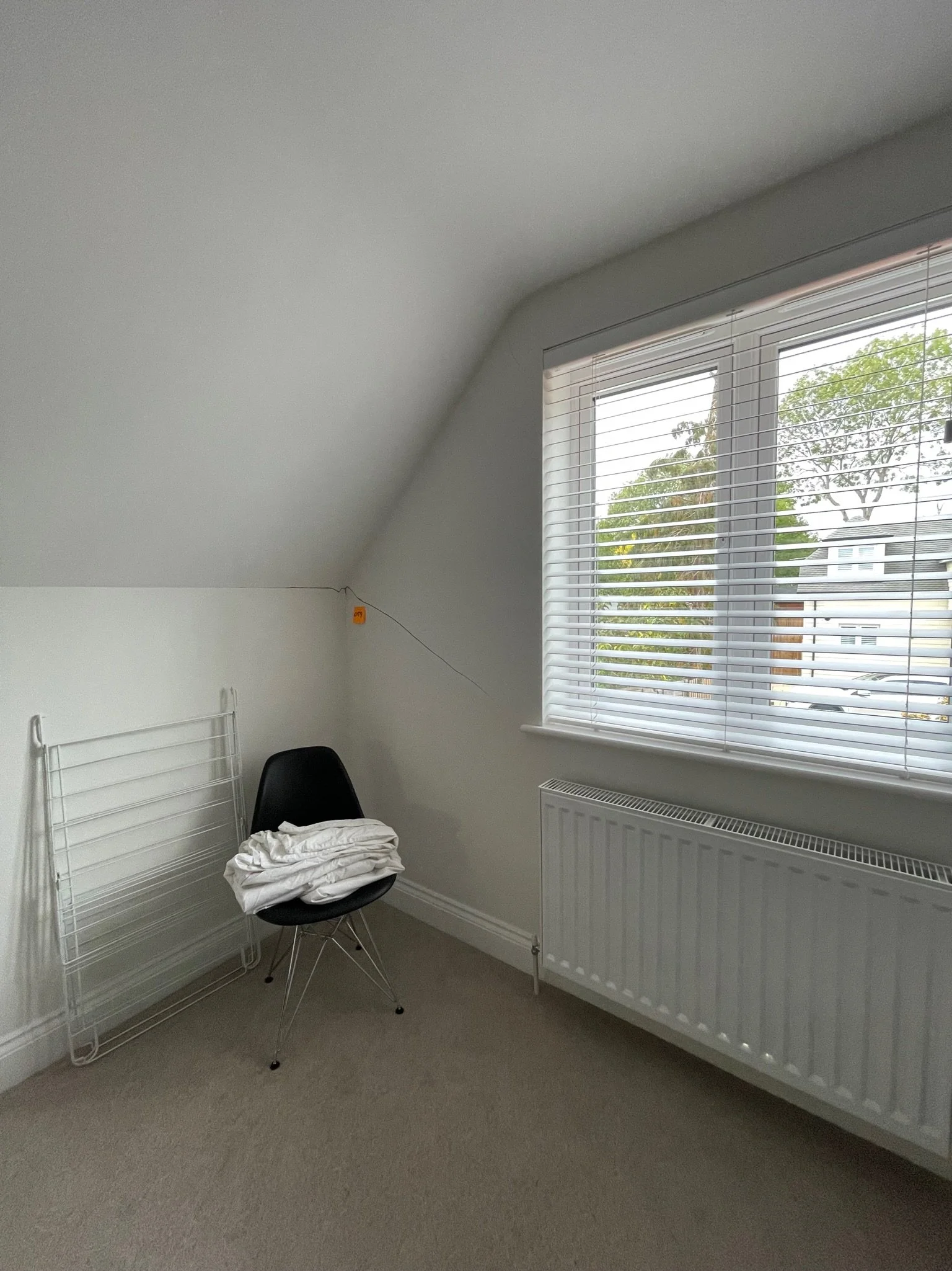 Minimalist room with white walls, a white carpet, and a window with blinds. A black chair with a white blanket on it and a metal clothes drying rack are in the corner. A white radiator is below the window.