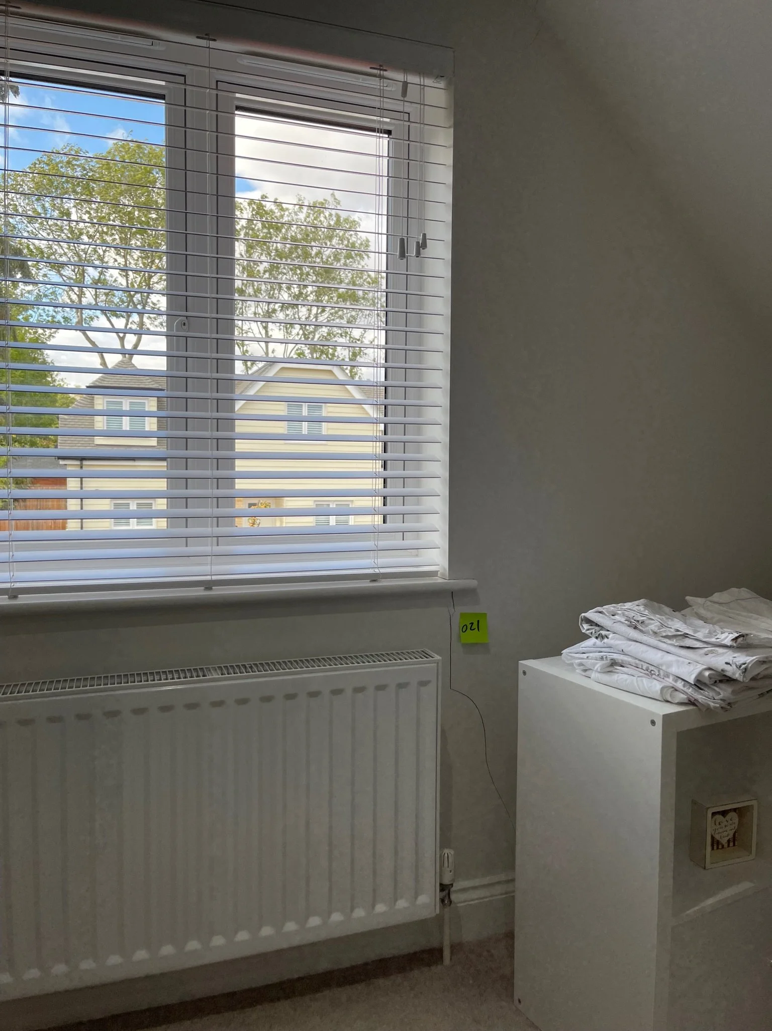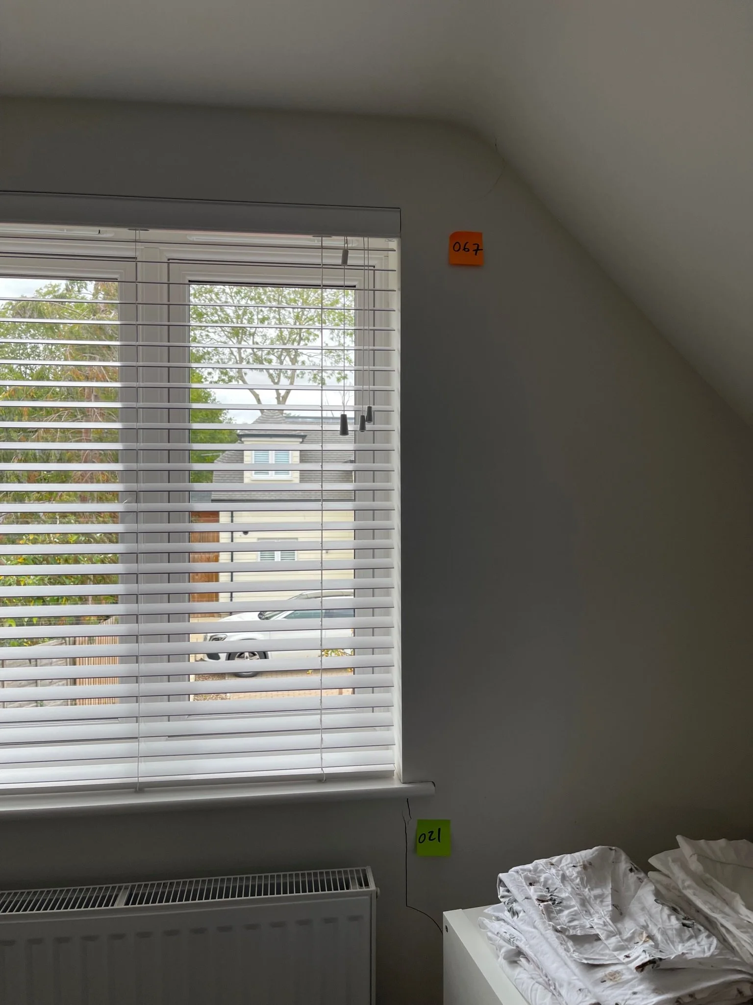 Room interior with a window featuring white horizontal blinds, partially open to reveal outdoor scenery. Beneath the window is a radiator. The wall has small, colorful numbered labels, '067' and '120'. A stack of folded white linen sits on a dresser.