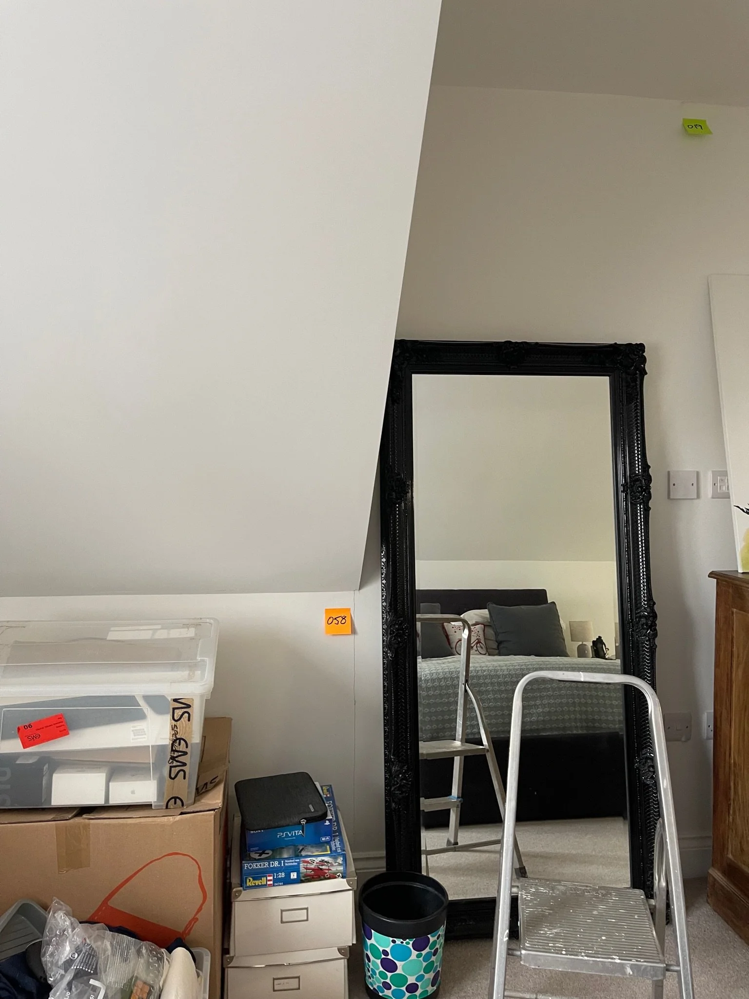 Room with a black-framed mirror reflecting a bed, cardboard boxes, and containers stacked on the floor. A step ladder and wastebasket with a polka dot pattern are in the foreground.