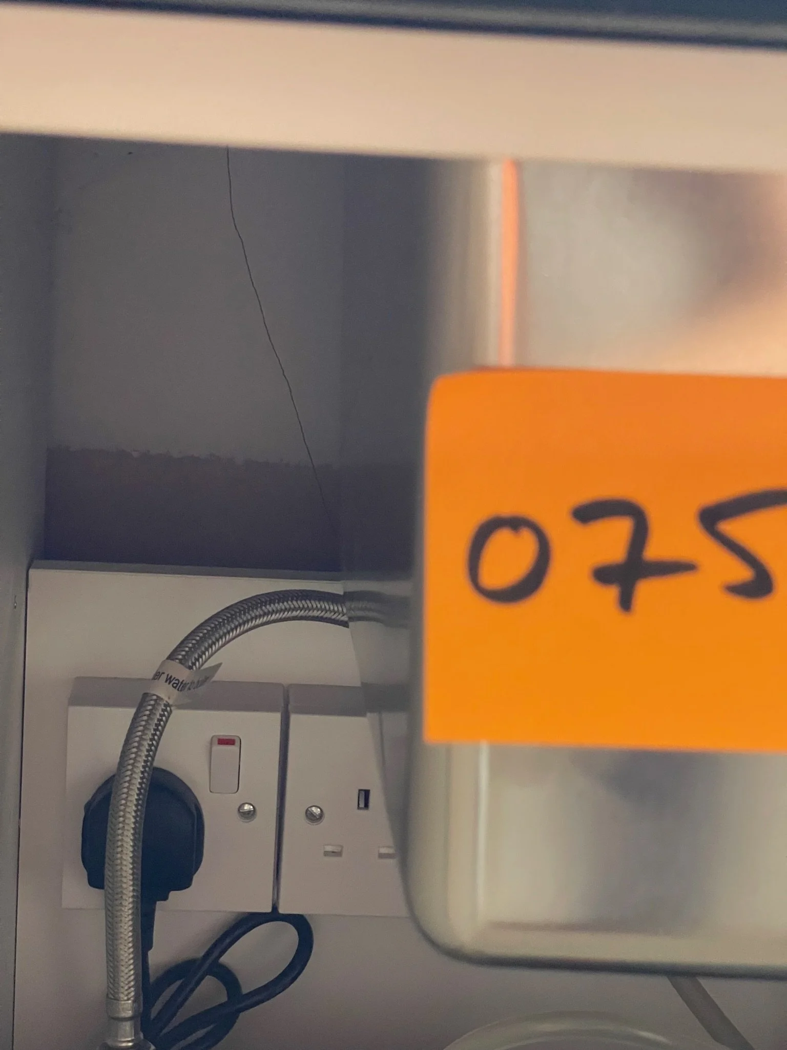 Electrical outlet with a switch and power cable, a flexible metal conduit, and a stainless steel surface with an orange sticker partially covering it.