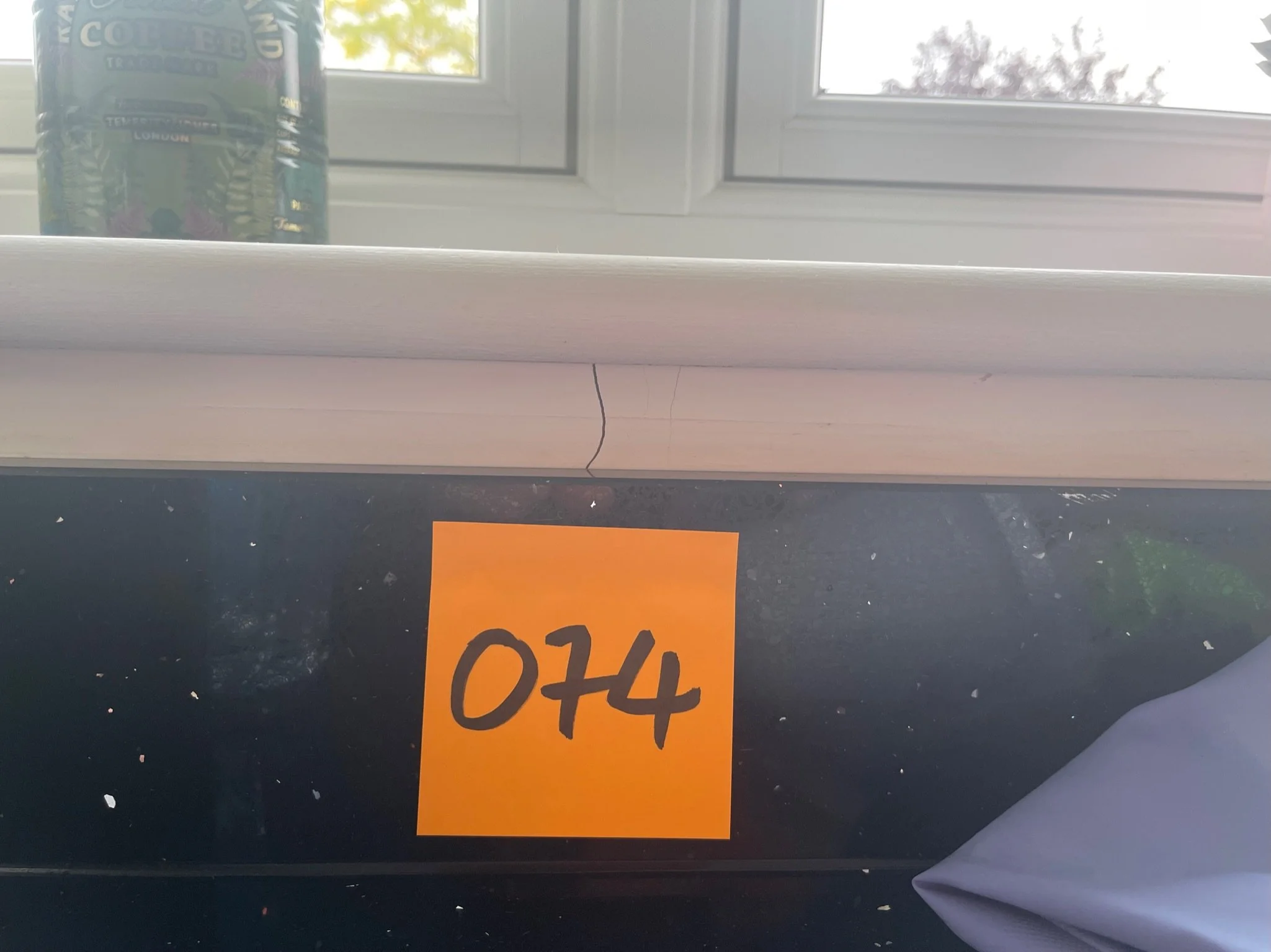 Sticky note with number 074 on a black surface, coffee tin and window in background.