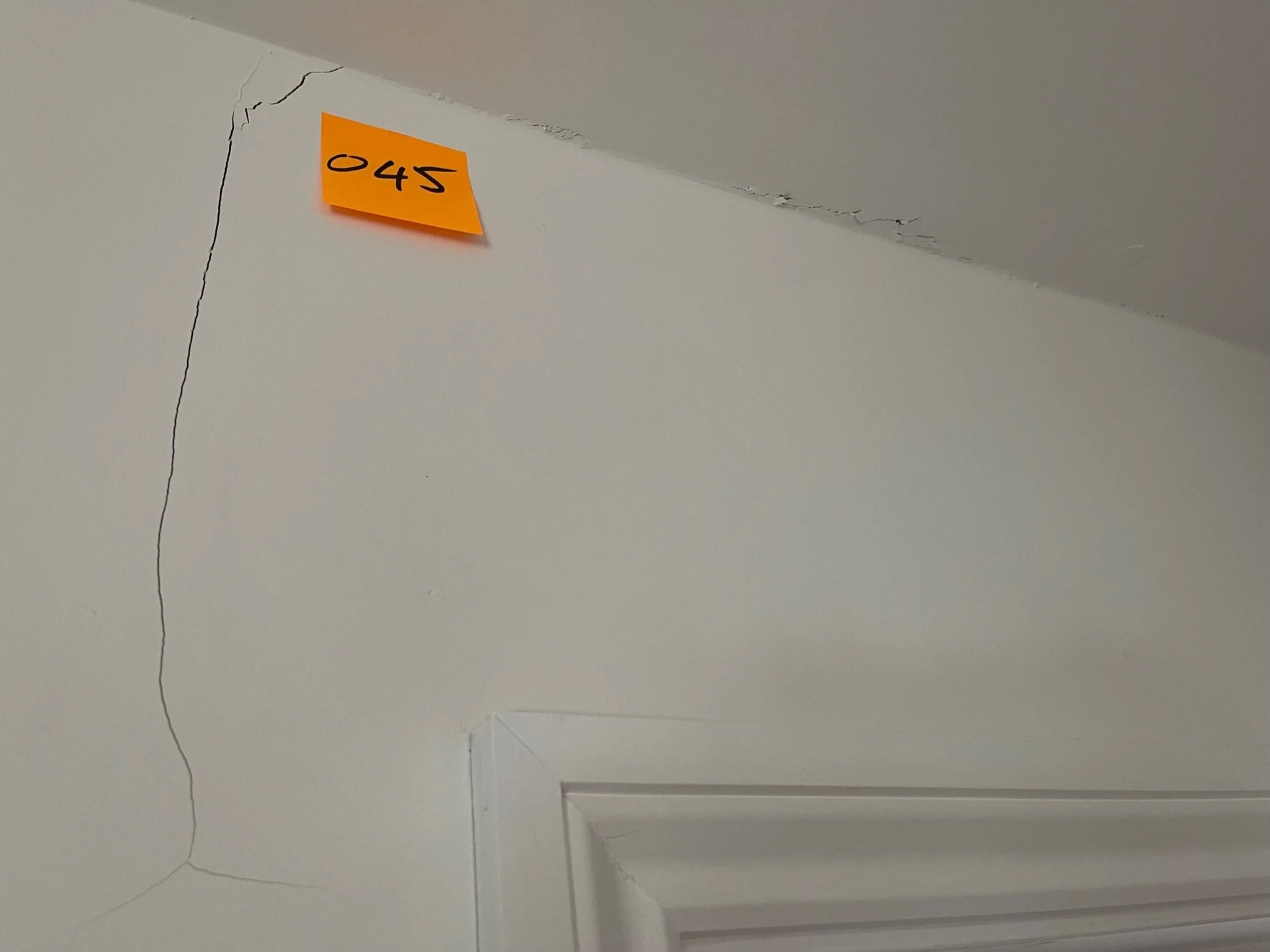 Close-up of a ceiling corner with a crack, marked by an orange sticky note labeled '045', located above a doorframe.