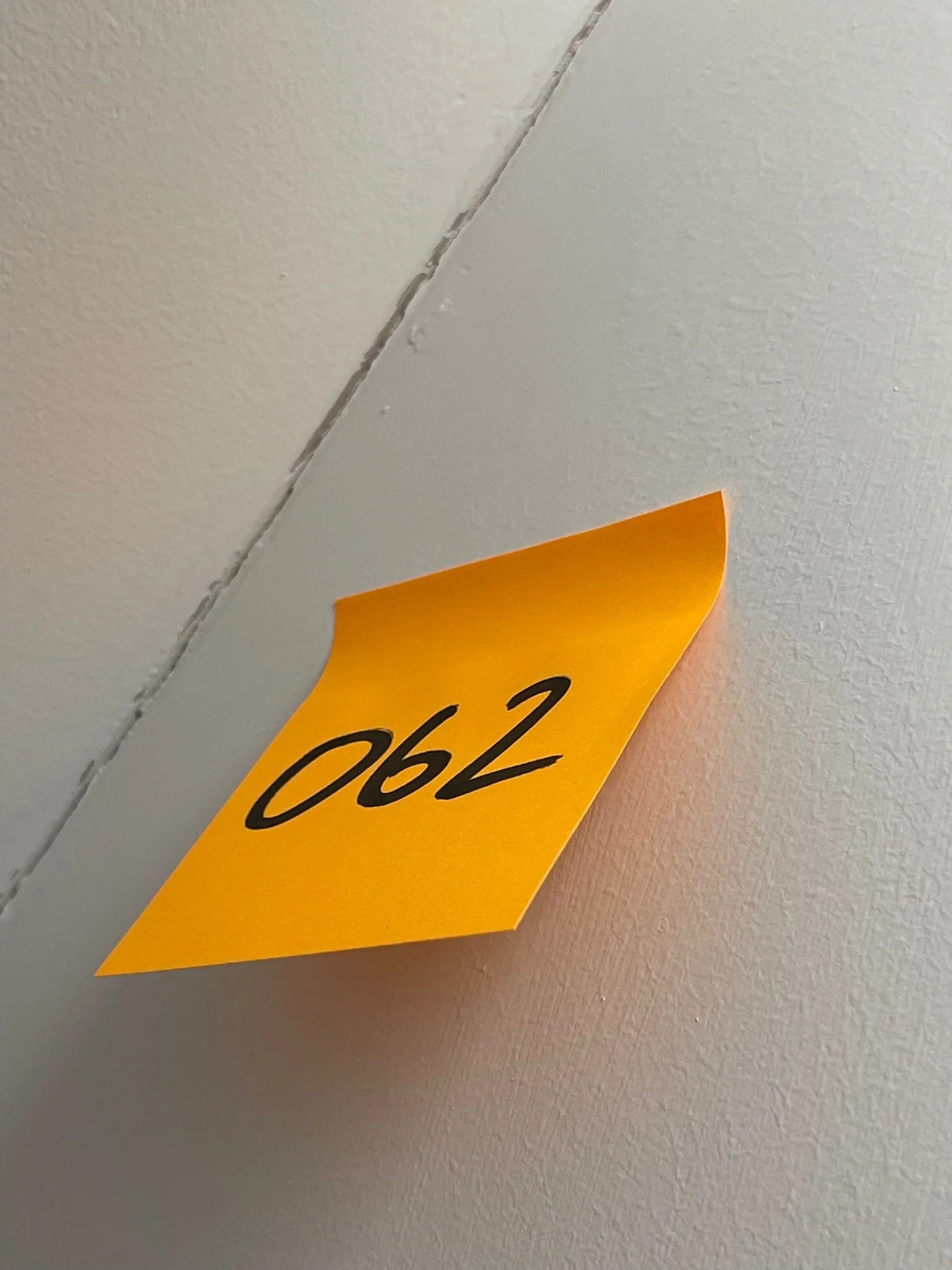 A white corner wall with a yellow sticky note labeled "062"