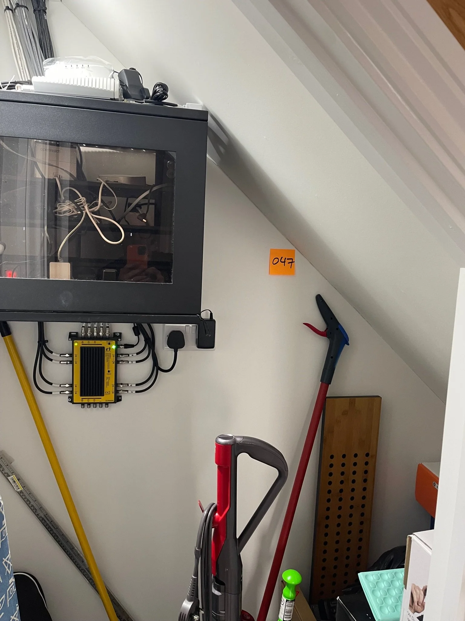 A small storage room with a network cabinet mounted on the wall, containing cables and electronic equipment. The room also has cleaning tools like a vacuum cleaner, mop, and duster, along with a power outlet and a yellow network splitter. Various oth