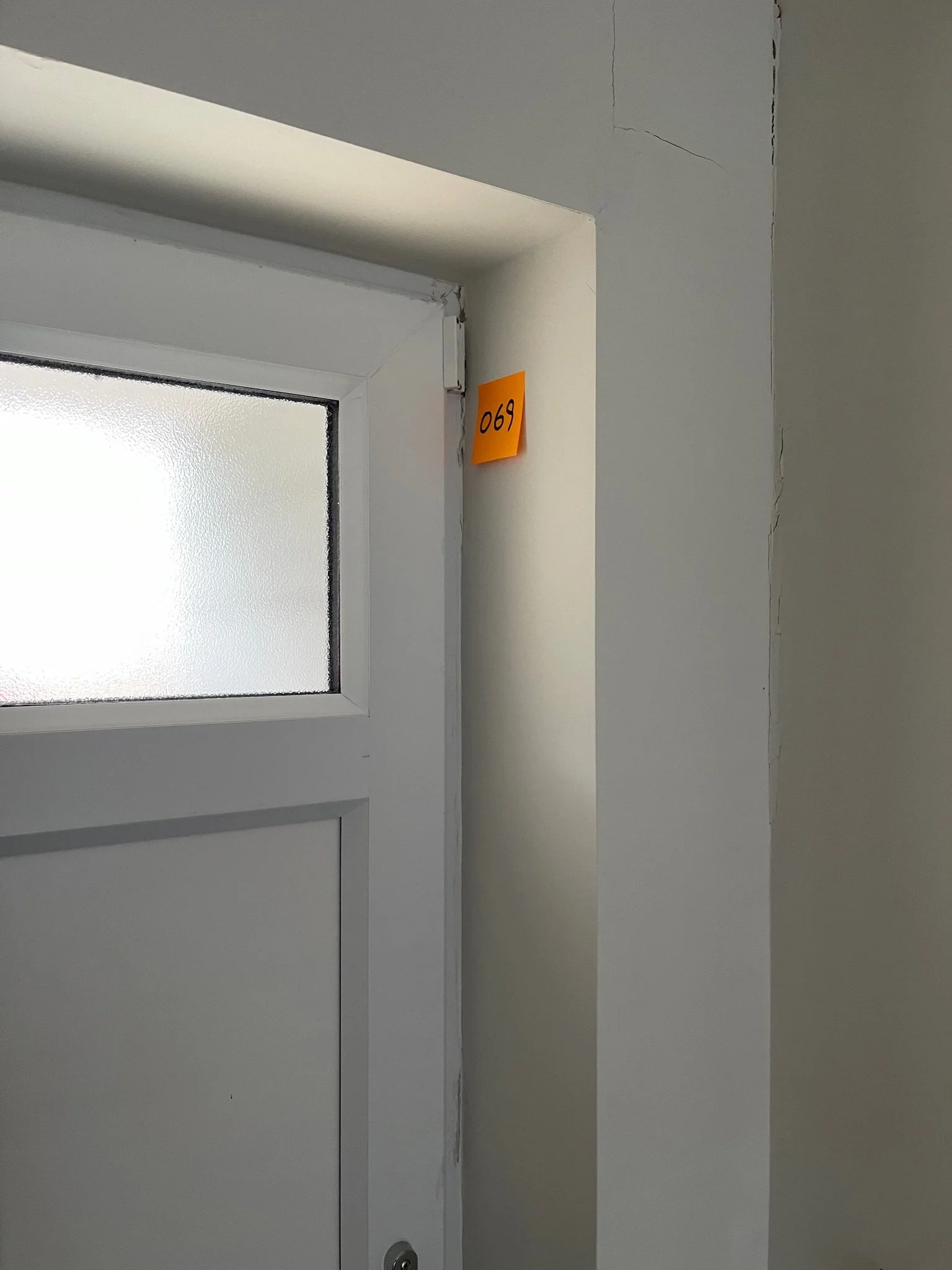 White door with frosted glass panel and wall with orange sticky note labeled '069'