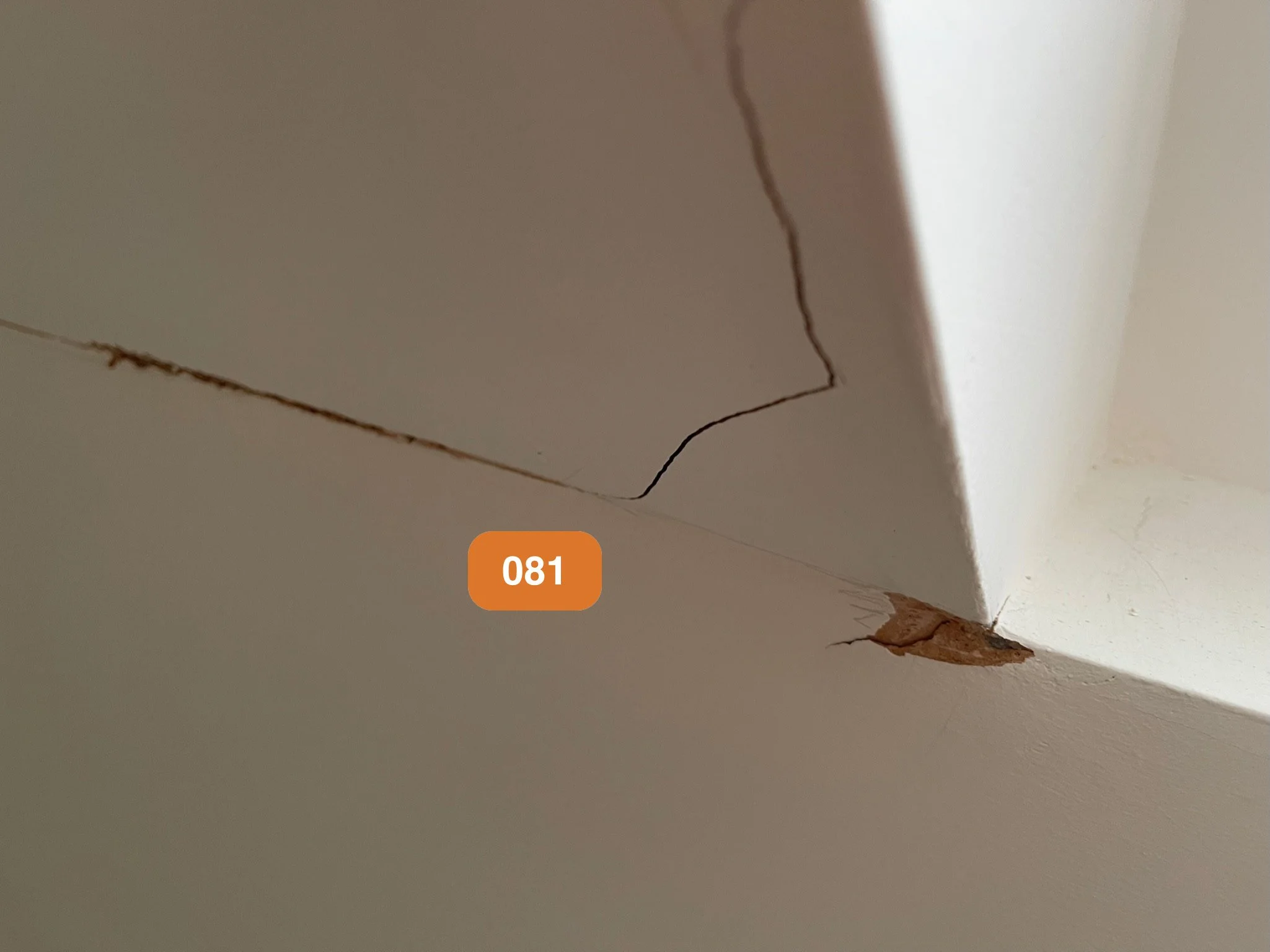 Close-up of a wall corner with visible cracks and paint damage, showing a numerical label '081' in an orange box.